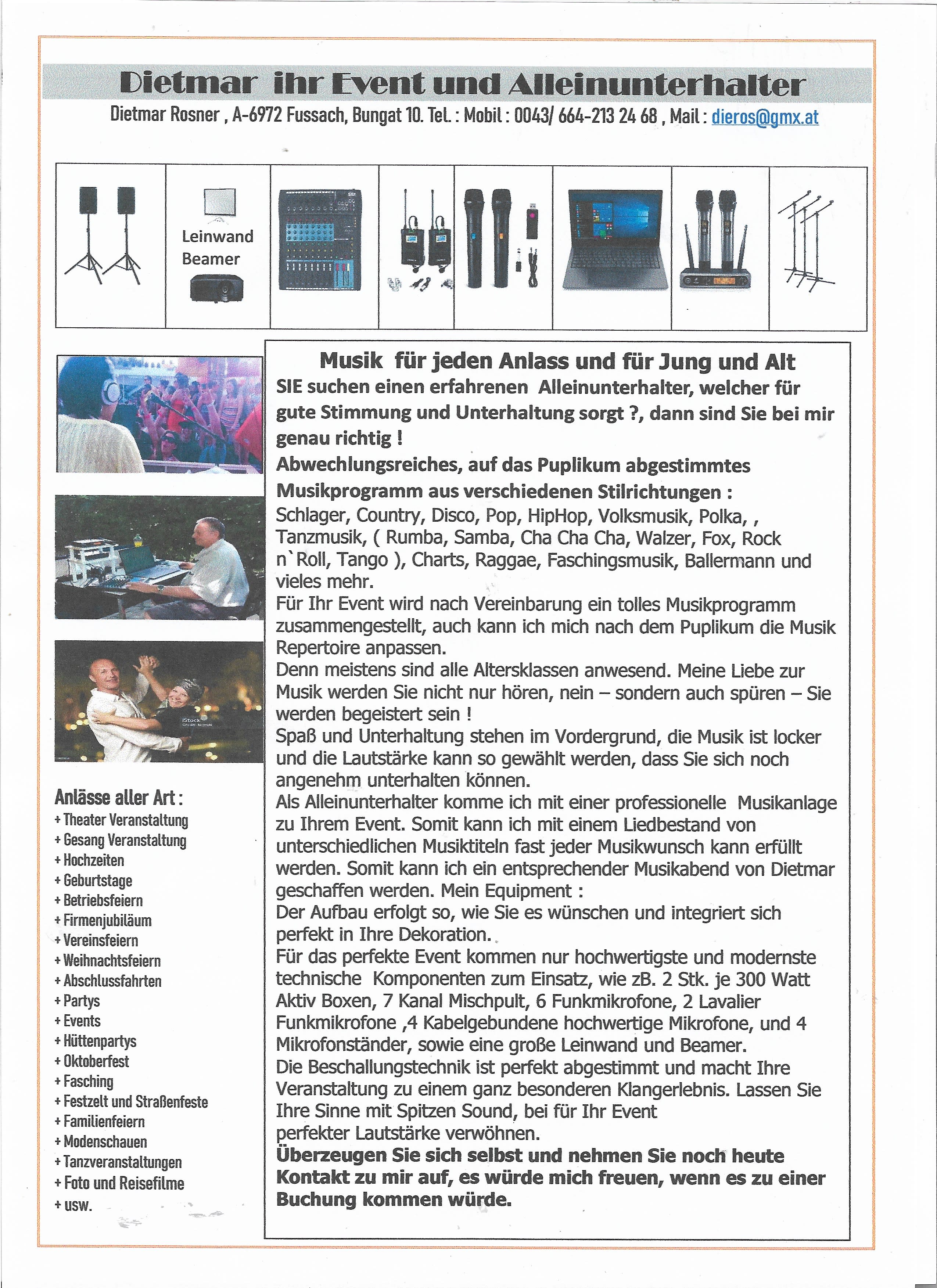 Hallo, ich bin DJ - Didi, komme aus Vorarlberg. Ich konnte schon etliche Veranstaltungen mit Musik erfreuen. Mit meinen vielfältigen Musikrepertoire ist für jung und Alt vieles dabei. Abwechslungsreiches, auf das Puplikum abgestimmtes Musikprogramm aus verschiedenen Silrichtungen : Schlager, Country, Disco, Pop, Hip-top, Volksmusik, Polka, Tanzmusik, Walzer, Fox, Rock´n Roll, usw. Gerade für Pensionistenvereine habe ich die passende Musik.