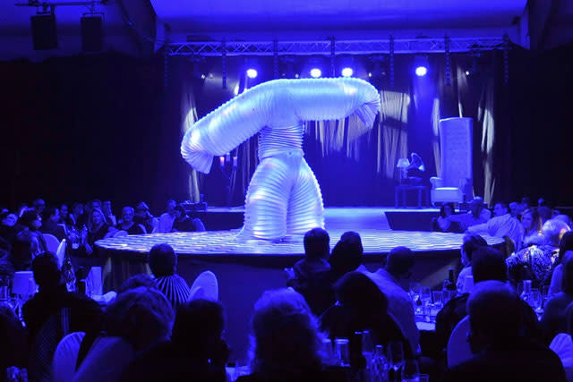 gespannt zur Bühne, auf der sich ein Röhrengebilde wie eine riesige Raupe zu allen Seiten